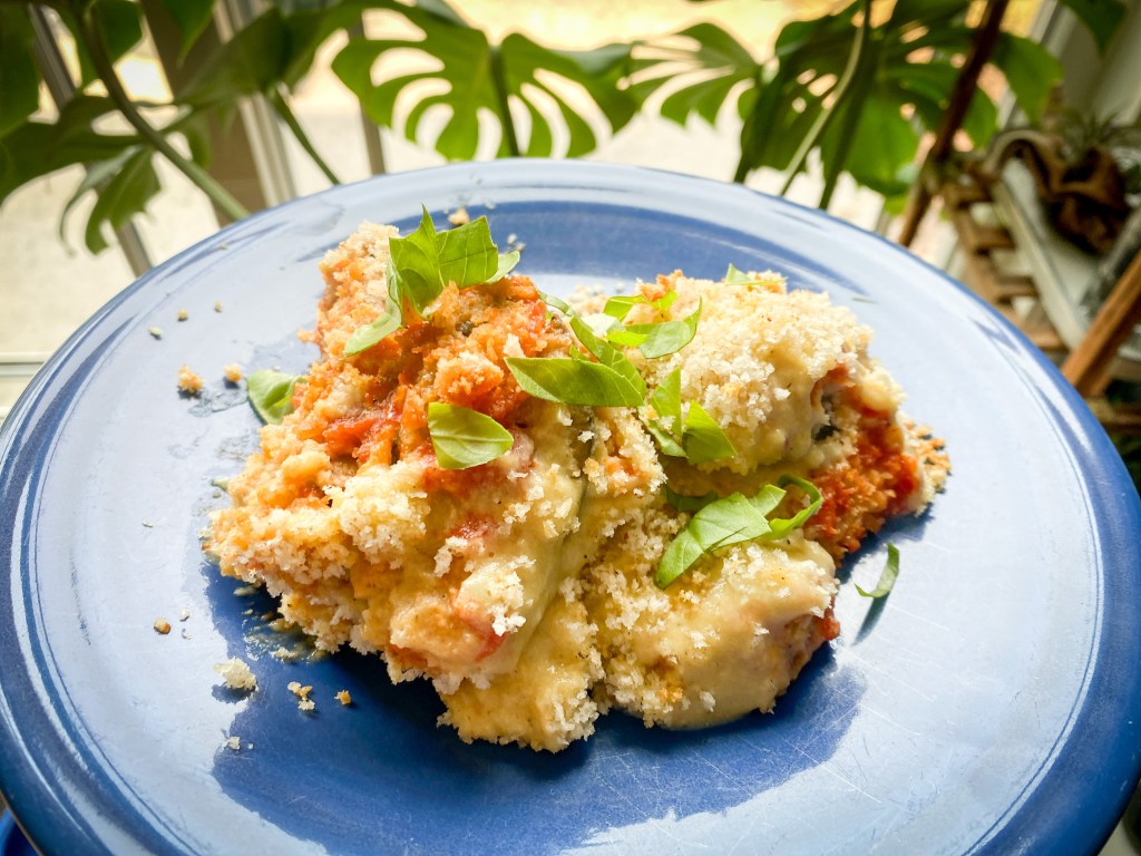 - Eggplant Parmesan-The batter was too thick (I think because I used oat milk instead), but otherwise the dish was a winner!