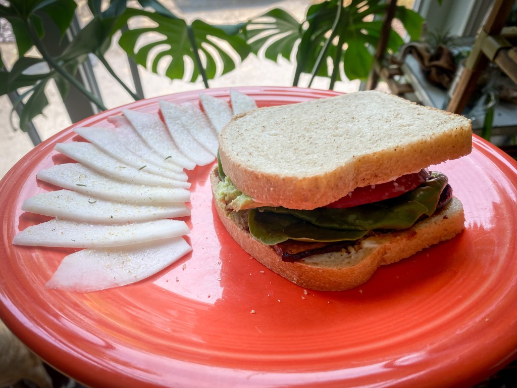 - BLT-Okay, maybe not really a BLT, but a ELSA (Eggplant, Spinach, Tomato, and Avocado). The marinade for the eggplant gave the sandwich so many complimentary flavors. I can’t say I cooked the eggplant long enough that it was crispy, but I loved it!